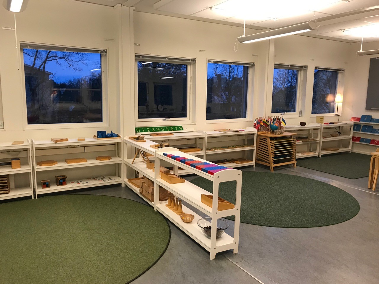 Vi använder oss av montessorimaterialet som lockar barnens alla sinnen. Montessorirummet är väl förberett och anpassat efter barnens ålder och behov. Barnen väljer fritt vad de vill leka med i det iordningställda rummet.